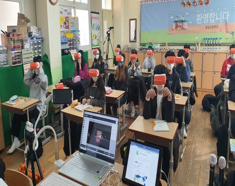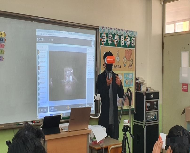 수업은 학생들이 우리 몸의 신비로움에 대한 동기유발 영상 자료를 보는 것으로 시작되었습니다. 그 후 교과서에 제시되어 있는 기본적인 지식, 우리몸은 어떻게 움직이는지, 음식물을 먹으면 어떻게 이동하는지 등을 2D 로 공부하고 학생들에게 VR 헤드셋을 1 대씩 나눠주고 우리 몸과 관련한 다양한 콘텐츠를 와이파이망으로 전송하여 학생들이 몰입감있게 과학 수업을 받을 수 있도록 했습니다.