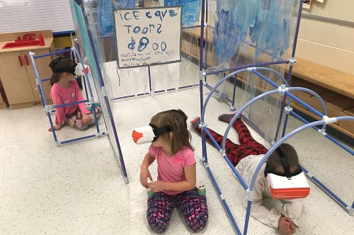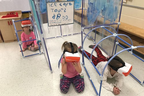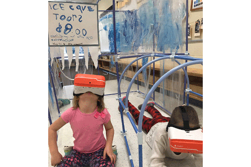 학생들은 360도 동굴 이미지를 사용하는 것으로 시작했는데, 이 경험은 이후 매우 다양한 질문, 조사, 발견, 창작, 그리고 글쓰기 활동을 하는 기반이 되었습니다. 헤드셋으로 동굴을 탐험한 후, 학생들은 질문이 많아졌습니다. 왜 고드름들이 걸려있나요? 동굴은 어떻게 형성되나요? 어떻게 동물들이 어둠 속에서 살 수 있었을까요? 두 번째 탐험에 나섰을 때, 학생들은 그들이 보고 있던 종유석, 석순, 기둥에 대해 신나게 이야기하면서, 동굴 안에서 사는 동물들을 열심히 찾아다녔습니다. 학생들은 교실 안에 큰 동굴을 짓고 종이와 디지털 책을 만들면서 발견한 것들을 재구성해냈습니다. 이 활동은 물과 얼음 동굴, 펭귄과 같은 얼음 동굴 안이나 빙하 위에 살 수 있는 동물을 조사하는 것으로 확장되었습니다. 학생들은 자신들의 키를 재서 이 동물들과 비교하기도 했습니다. 마지막으로, 학생들은 교육 비디오를 만들고, 방문객들이 교실의 동굴을 방문했을 때, 상호작용을 할 수 있도록 동굴 벽에 QR 코드를 부착하였습니다.